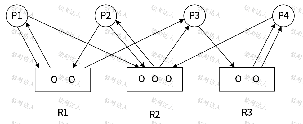 假设系统中有进程Pi (i=1,2,3,4),资源Rj (j=1,2,3),且资源R1、R2、R3的可用数分别为2、3、2。系统的进程资源图如下图所示,当有向边由Pi指向Rj时,表示进程Pi申请一个资源Rj;当有向边由Rj指向Pi时,表示将一个资源Rj分配给进程Pi。如果进程申请的资源得不到满足,则该进程处于等待状态;否则该进程处于非等待状态。该图表明( )。对该进程资源图可以进行化简,其正确的化简顺序为( )。(注:化简是指图中的进程得到所需资源,可运行完毕并释放所占用的资源)
