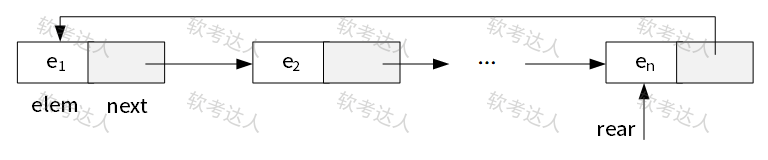 假设队列采用不含头结点的循环单链表示,rear指向队尾结点,如下图所示,其中,结点的数据域elem表示元素值,指针域next 指向后继结点,那么表示队列中仅有一个元素的条件是( )。