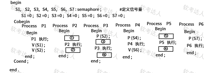 若用PV操作控制这6个进程的同步与互斥的程序如下,那么程序中的空①和空②分别为( ); 空③和空④处应分别为( ); 空⑤和空⑥处应分别为( )。