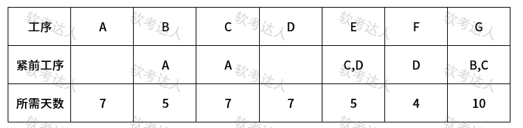 某项目共有A-G七道工序,各道工序所需的时间(天数)以及工序之间的运行关系如下表。该项目计划的最短工期为( )天。假设每道工序只需要一人做,都可以做所有各道工序,但不能同时做多道工序,那么该项目至少需要( )人。