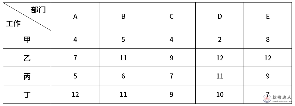 企业从部门中选择四个部门下月做甲、乙、丙、丁四项工作,每个部门做一项工作。已知每个部门做每项工作所需的成本(单位:万元)