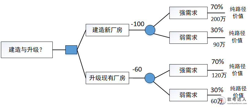 某厂房建设或者升级的两种方案的决策树分析如下图所示,由图可知,组织宜选择( )的方案,因为该方案的EMV为( )万元。
