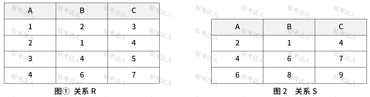 假设关系R和S分别如下图①和图②所示,那么关系代数表达式R∩S的结果集等于( ) ;的结果集的属性列数和元组数分别为( )。