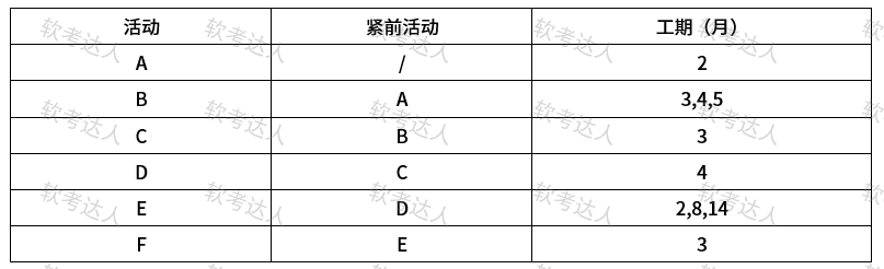 某项目各活动的先后顺序及工作时间如下表所示,活动B和E的三个数值为三点估算值,则该项目的总工期为( )月。