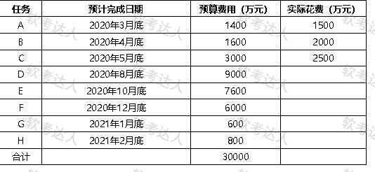赵工的项目报告描述如下∶5月底财务执行状况很好,只花了6000万元。进度方面,已完成A、B任务,尽管C任务还没有完成,但项目团队会努力赶工,使工作重回正轨。按照公司的要求,赵工同时提交了项目各任务实际花费的数据(见下表)