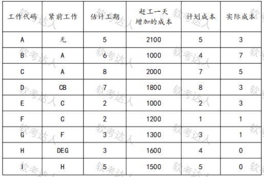 说明:项目经理根据甲方要求评估了项目的工期和成本。项目进行到20天的时候,项目经理对项目开展情况进行了评估,得到各个活动实际花费成本(如下图),此时ABCDF已经完工,E仅完成了二分之一,G仅完成了三分之二,H尚未开工。