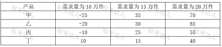 某公司主营产品有甲、乙、丙、丁四种。按照历史数据预测,下半年的市场需求总量可能有10万件、15万件和20万件三种情况,对应的概率分别为50%、30%、20%不同情况下各产品带来的市场收益(单位:万元)如表所示。为了追求利润最大化,该公司应该生产( )。