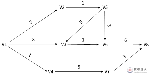 【考生回忆版】下面是某小区内部道路图,线上的数字为两点之间的距离,现在需要从V1向V8运送物资,则最短的距离为( )。