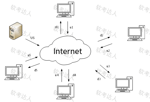 如下图所示,假设服务器要分发一个5G比特的文件给 5个对等体 (Peer),服务器上传带宽Us为54Mbps, 5个对等体的上传带宽分别为:u1=19Mbps、u2=10Mbps、u3=19Mbps、u4=15Mbps、u5=10Mbps;下载带宽分别为:d1=24Mbps、d2=24、d3=24Mbps、d4=27Mbps、d5=29Mbps。则采用C/S模式和P2P模式传输最小时间分别是( )秒。