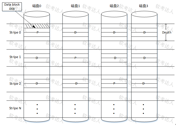 1. 图2-1 所示,RAID 的条带深度是(4)KB,大小是(5)KB。