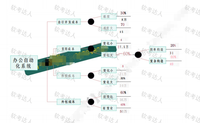 件 ;③外 购现成的软件 产品;④外包 给专 业公司 开发。针 对 这几种 方式,项 目经 理提 供了如 下 图所 示的决 策