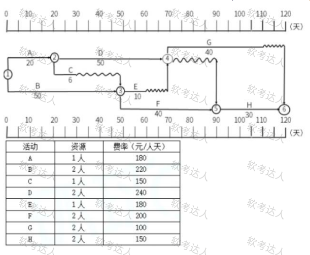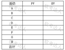 项目组根据工期要求,资源情况及预算进行了工期优化,即将活动 B 压缩至 30 天,活动 D 压缩至 40 天,并形成了 最终进度计划网络图。项目活动所需资源数量和资源费率如表所示。按最终进度计划执行到第 40 天晚,对项目检 测时发现,活动 D 完成一半,活动 E 准备第二天开始,活动 F 完成了 1/4;此时累计支付的实际成本为 4 万元。请在 下表中填写此时该项目绩效信息。第 40 天末,请补全下表 PV、EV 的数值。