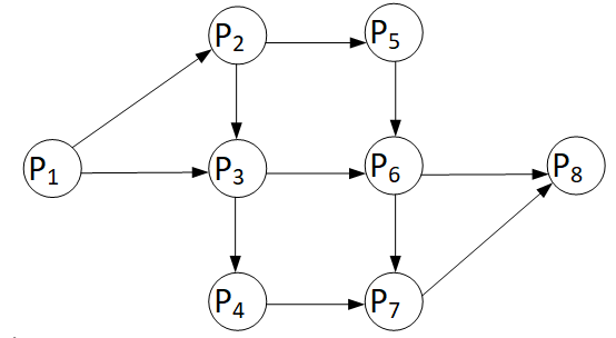 前趋图(Precedence Graph)是一个有向无环图,记为: →= {(Pi,Pj)Pi must complete before Pj may start}。假设系统中进程P={P1,P2,P3,P4,P5,P6,P7,P8}, 且进程的前趋图如下: