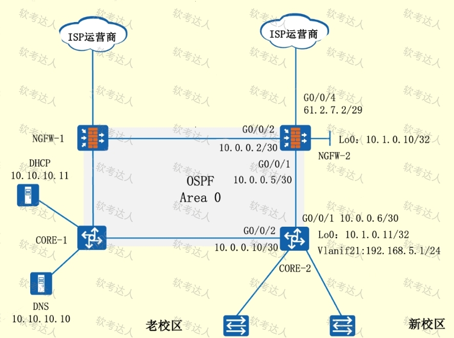 说明某高校网络拓扑图,如下图所示,两校区核心(CORE-1和CORE-2)、出口防火墙(NGFW-1和NGFW-2)通过配置OSPF完成收敛,两校区相距40KM