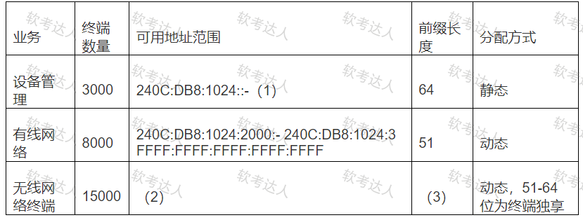 新校区规划以双栈方式部署IPV6网络,分配的IPv6地址为:240C:DB8:1024::/49。请将IPv6网络地址规划表补充完整