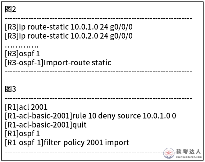 某网络拓扑如图1所示,路由器R1、R2、R3已完成相关配置,且建立OSPF邻居关系,在路由器R3配置静态路由并引入到OSPF,详见图2,在路由器R1上配置ACL过滤10.0.1.0的路由条目在OSPF的引入配置详解图3,ACL配置完成后,路由器R1的路由表如图4所示,此时,在路由器R1没有到23.1.1.0,10.0.2.0的路由,造成该问题的原因是( )。